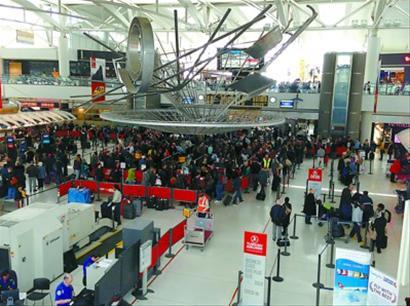 受控制塔台关闭、安全检查人员和边检人员减少的多重影响,美国多地的枢纽机场亦开始不堪重负。在日前前往纽约肯尼迪机场的1号航站楼候机厅参加活动时,记者就亲身体验了这一“非常态”情形。由于受到有关方面邀请,尽管记者在机场安检时走的是头等舱通道,但是安检速度依然很慢。平时,安检口前核对证件和登机牌的人员会有4人,但当天只有2人,安检门也只开了两处。不仅出发排队的时间变长,到达也遭遇同样情况。在到达区的电子信息屏上,无论是来自亚洲还是欧洲的航班都被延误20―30分钟左右。当被问及出关排队情况时,下机的乘客都说要排很长的队伍。