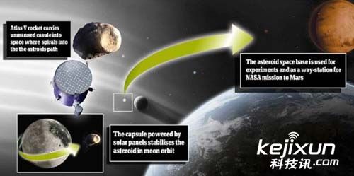 美国白宫科学技术政策办公室准备制定今后10年的太空探索安排,将在未来几周考虑这项需要耗资16亿英镑(25.85亿美元)的计划。如果该计划得到批准,它将成为有史以来第一个被人类移动的天体。在美国宇航局和加州理工学院准备的一份可行性报告里,科学家概述了他们将如何捕捉小行星。一个“小行星捕获太空舱”将被拴在一枚旧“阿特拉斯5”火箭上,用来引导位于地球和月球之间的小行星。随后这个飞行器会开启推进器,利用大约300公斤推进物阻止目标小行星前进,并把它拖到一处引力平衡点。太空探险家将把它作为一个飞往太空更深处的固定基地。
