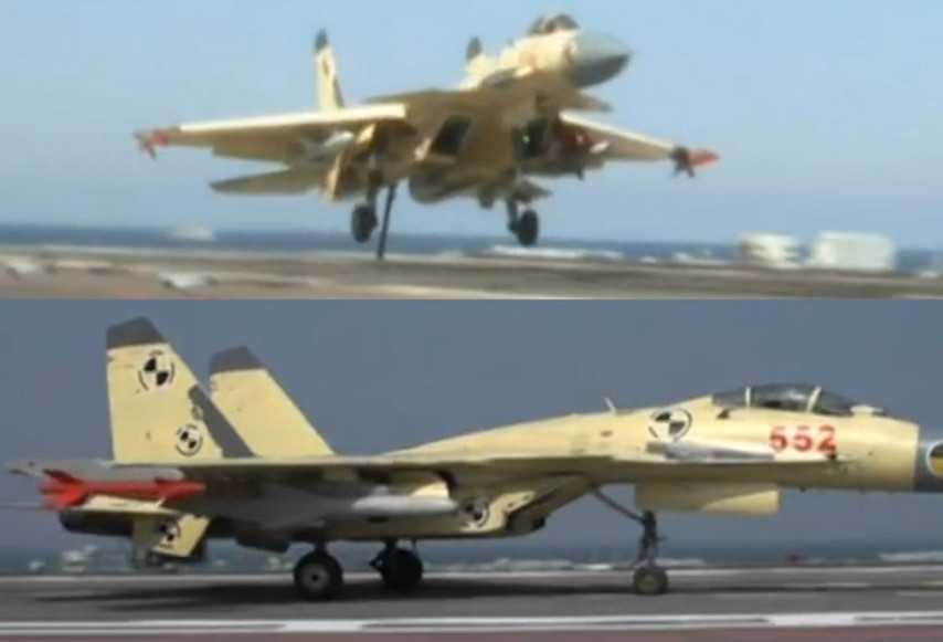 9月17日晚,央视军事频道播出国产歼15舰载战斗机挂弹在航母辽宁舰上滑跃起飞降落视频。网友分析,画面中,多架歼15分别挂载了无控航空炸弹模拟弹、YJ-83K模拟反舰导弹、霹雳-8近距格斗模拟导弹。这也是官方首次公开的歼15舰载机挂弹训练视频。