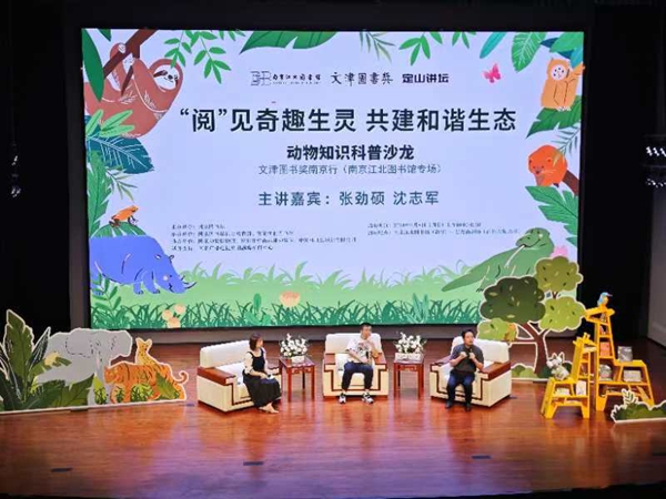 9月8日,“‘阅’见奇趣生灵 共建和谐生态”动物知识科普沙龙在南京江北图书馆(新馆)举行。沈志军结合书籍《红山动物园是我家》,向读者讲述饲养员与动物之间那些温馨、有趣且难忘的故事,感受人与动物的情感羁绊。张劲硕分享国内外成功的动物保护项目、人与自然和谐共处的实例,鼓励读者从身边小事做起,参与动物保护行动,共建和谐生态环境。两位专家进行了生动有趣的动物科普对谈,吸引了近300名读者与动物爱好者亲临现场。南京江北图书馆设置了文津图书奖动物类主题图书专架,并推出了南京红山森林动物园走读之旅等丰富多样的配套活动。