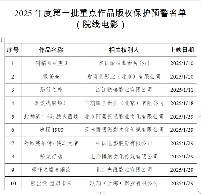 此外,根据《关于开展院线电影版权保护专项工作的通知》《关于进一步加强互联网传播作品版权监管工作的意见》及版权重点监管工作计划,国家版权局公布了2025年度第一批重点作品版权保护预警名单。