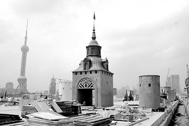 为迎接“哥德堡”号的到来,北外滩码头正抓紧搭建仿古城堡。本报记者刘定传摄