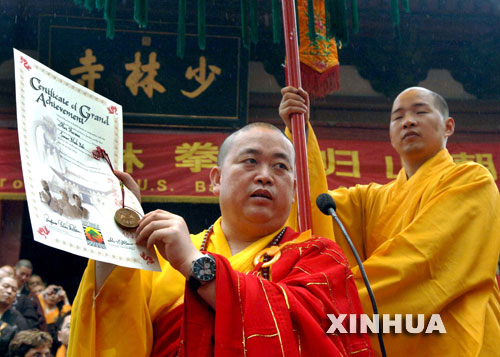 在美国少林武术爱好者的一次拜师活动中,少林寺释永信方丈用英文宣读学习证书(资料图)