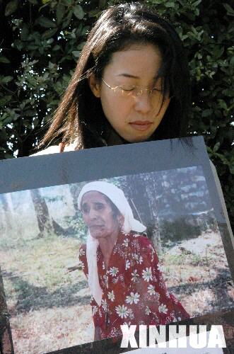 资料图片:2006年3月15日,在日本首都东京的国会前,一名参加抗议的妇女手持受害者的照片。新华社记者马平摄