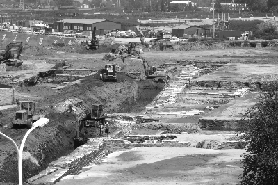 通过一番努力,记者跟随施工车辆从南门进入工地。走过一段泥泞的道路,东城门遗址完全呈现在眼前。大遗址格局完整,城内道路、铺地、排水道痕迹清晰。遗址的北端不远处,地铁施工队仍在施工。