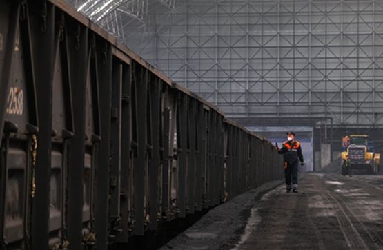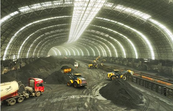 储备基地环保大棚内机械设备正在进行煤炭装车作业。(杨宝森/摄)