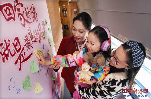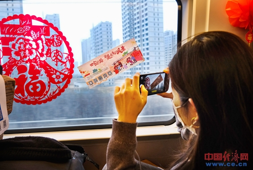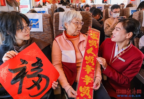 乘务员现场写“福”字春联,将美好的祝福送给旅客,还为旅客送上精美的蛇年纪念品和糖果,最后乘务员为旅客演唱喜庆歌曲,让旅客在旅途中忘却疲惫,感受到家一样的温暖。(中国经济网记者 佟明彪)