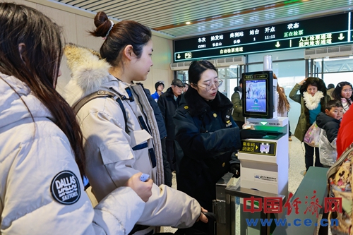 白山东站服务人员在进站通道为旅客验票乘车。(国铁集团沈阳局集团公司供图)