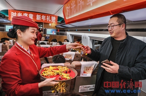 乘务人员为旅客送上迎新年纪念礼品。杨宝森/摄