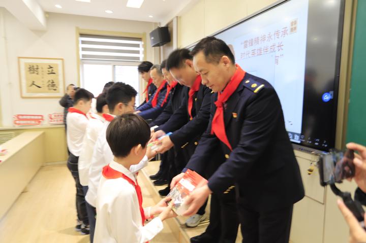9时20分,活动正式开始。少先队员为到场的嘉宾敬献红领巾,现场气氛庄重热烈。中心志愿者服务大队和G1226爱心志愿队向学校赠送雷锋故事、红色经典书籍,以书香浸润童心,用红色文化铸魂育人。活动中,少先队员为沈阳客运段动车二队列车长贾淼、中心火车头奖章获得者、学雷锋标兵陶忠祥颁发“校外辅导员”聘书,搭建起校地共建、共育新人的长效桥梁。