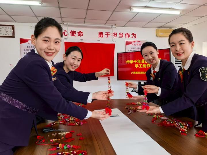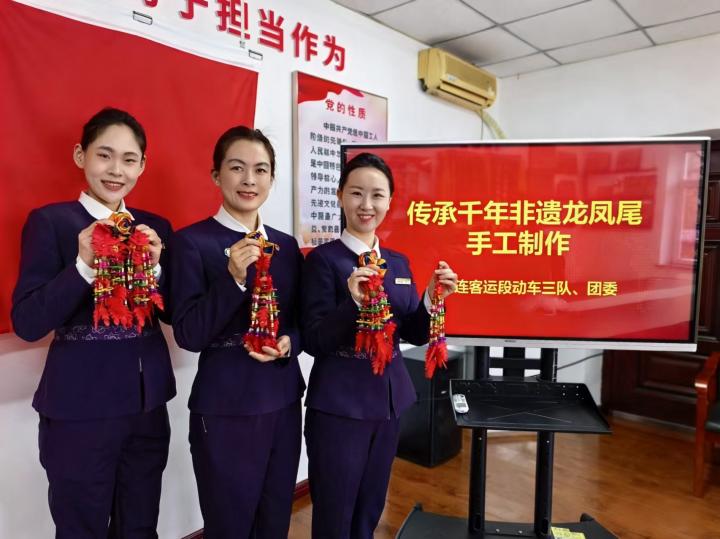 担当该趟列车乘务工作的列车长刘洋介绍,动车三队担当的5.5对列车途经庄河北站,而“龙凤尾”是大连市非物质文化遗产“庄河二月二”习俗的重要组成部分,已有千年历史。为营造浓厚民俗氛围,车队特意邀请非遗传承人对列车工作人员指导,亲手制作“龙凤尾”——将高粱秸剪成寸段,把花布剪成方片凤尾或圆片龙尾,再用红线、蓝线串联,每一串都承载着对旅客的美好祝福。