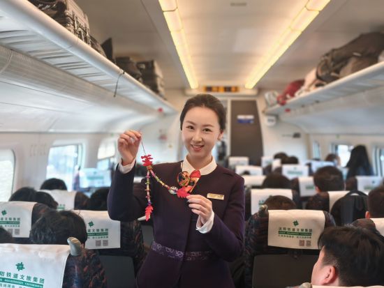 列车内,喜庆的窗花让旅客一上车就感受到非遗文化的魅力。列车员为旅客赠送“龙凤尾”时,还详细介绍其制作工艺、佩戴习俗,讲解“庄河二月二”民俗的历史与传承,同时普及乘车安全注意事项,让旅客旅途安心又暖心。