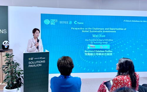 12月4日,TCL科技集团副总裁、ESG办公室主任、TCL公益基金会理事长魏雪出席《联合国气候变化框架公约》第28次缔约方大会(COP28)蓝区金融主题边会,并发表主旨演讲,分享企业应对气候变化的策略及实现可持续发展的实践经验。