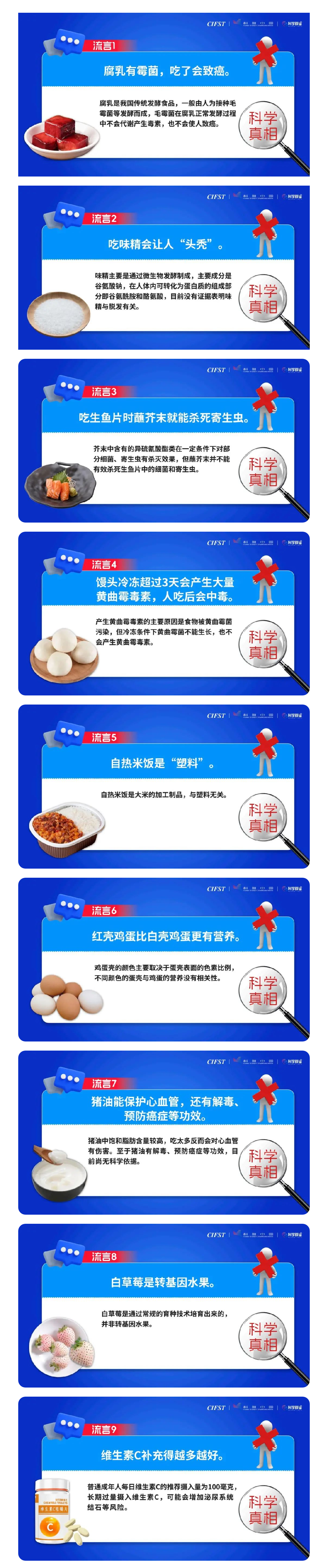 中国经济网北京1月6日讯(记者 韩肖)1月5日,由中国食品科学技术学会主办的“2023年食品安全与健康热点科学解读媒体沟通会”在北京举办。会上,中国食品科学技术学会名誉副理事长、北京工商大学食品与健康学院教授罗云波发布“2023年食品安全与健康流言榜”,包括“腐乳有霉菌会致癌”“吃味精会头秃”等9条流言上榜。