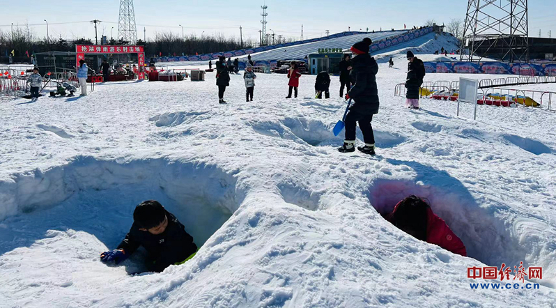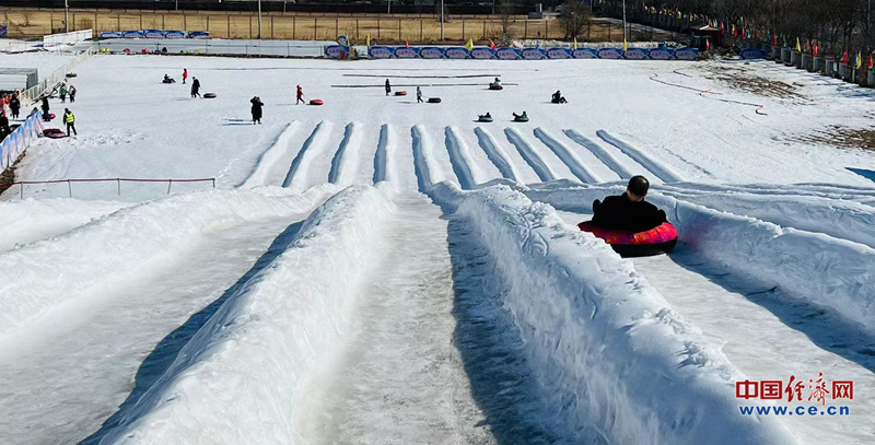 市民在冰雪嘉年华体验雪上香蕉船。