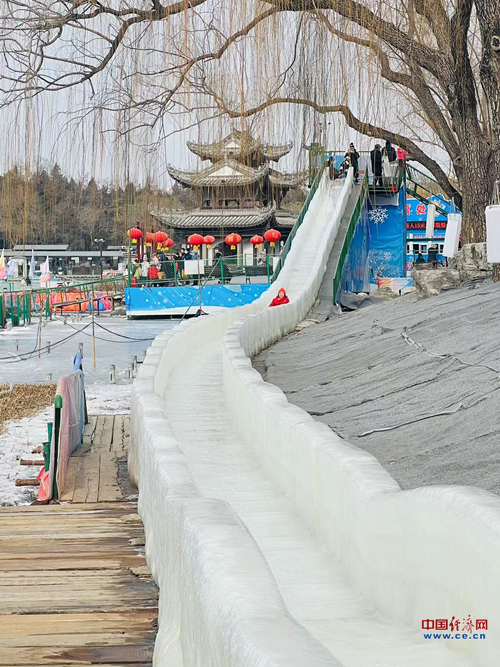 市民在陶然亭公园体验冰滑梯。