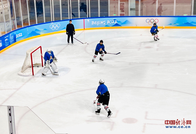冰球“小将”们在华熙冰上中心练习打冰球。