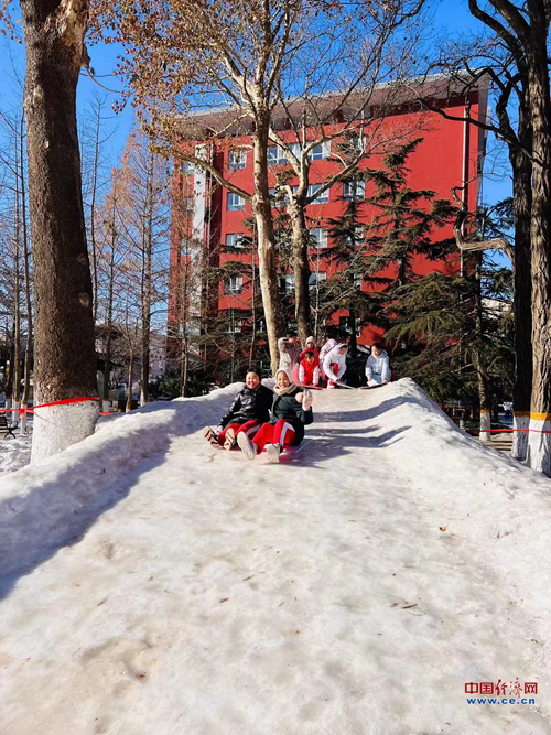 北京育英学校搭起自制冰(雪)滑梯,学生们利用午休时间体验冰雪之乐。