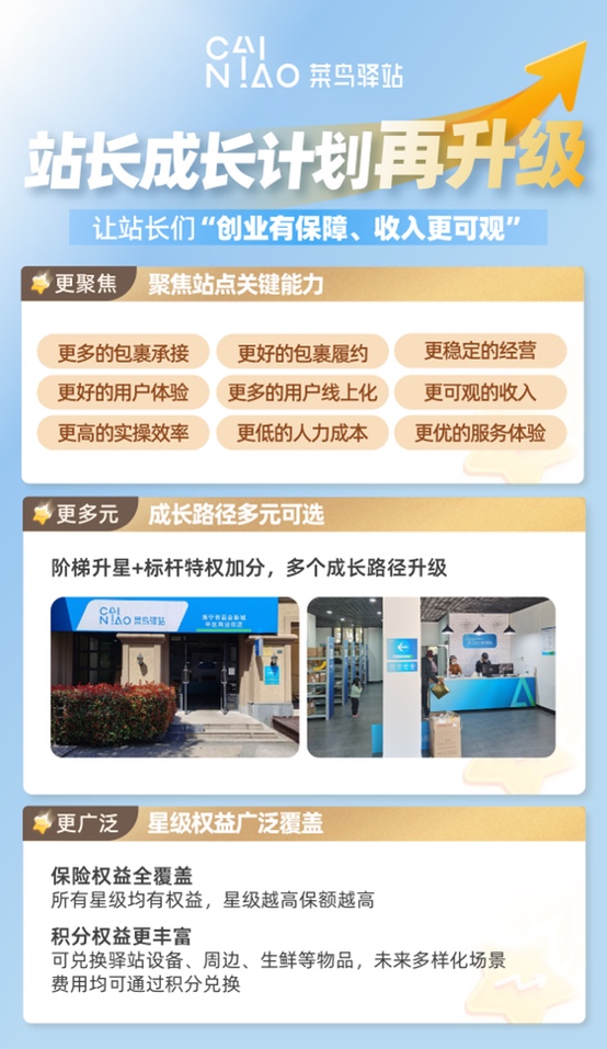 持续赋能站长成长。近期,菜鸟驿站正式推出新星级评定体系,通过升级相关权益和成长路径,提高站长保障与支持,并结合“百站千站万站”标杆驿站实现多种组合并举,让站长群体“创业有保障、收入更可观”。