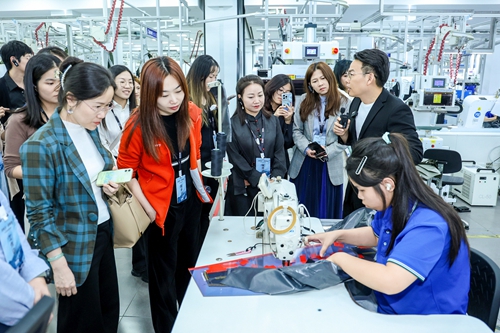 而在智能制造生产工厂的参观中,嘉宾们更是深入生产线,观摩了羽绒服从剪裁、缝制到全检中心等各个生产流程,亲眼见证了波司登如何将匠心精神融入每一处细节。在裁剪生产区,自动裁剪机以其精准的版型与100%的裁片正确率,彰显了波司登对精确度的执着;步入自动生产区,按纸样版型精心设计的模板工具,沿固定槽位标准化缝制,实现了缝制品质与一致性的双重100%,凸显了对工艺细节的至高追求;后整生产区,一套5人流水检验流程与严格的成衣检针金属异物管控,共同守护每一件成衣的品质无瑕;至于充绒间,自动充绒机凭借0.01g的精准称重,配合充绒后超声波直接封口技术,彻底杜绝了搬运过程中的漏绒风险。波司登对工艺细节的极致追求和高端品质的坚持,在此得到了完美诠释。