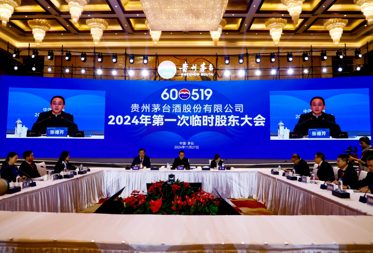 11月27日,贵州茅台2024年第一次临时股东大会在茅台大酒店召开。此次会议“一口气”审议了《2024—2026年度现金分红回报规划》《2024年中期利润分配方案》《关于以集中竞价交易方式回购公司股份的方案》等多项议案。