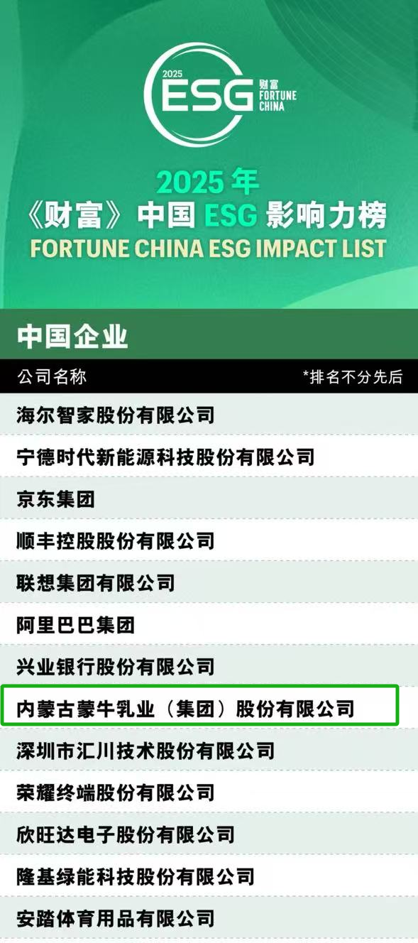 5月16日,《财富》中国ESG影响力榜正式揭晓,蒙牛集团凭借在环境、社会及公司治理(ESG)领域的卓越表现从近300家企业中脱颖而出,成为唯一上榜的中国乳制品企业。这一荣誉不仅是对蒙牛可持续发展战略的认可,更彰显了蒙牛以科技创新与全产业链责任实践应对全球挑战的坚定决心。