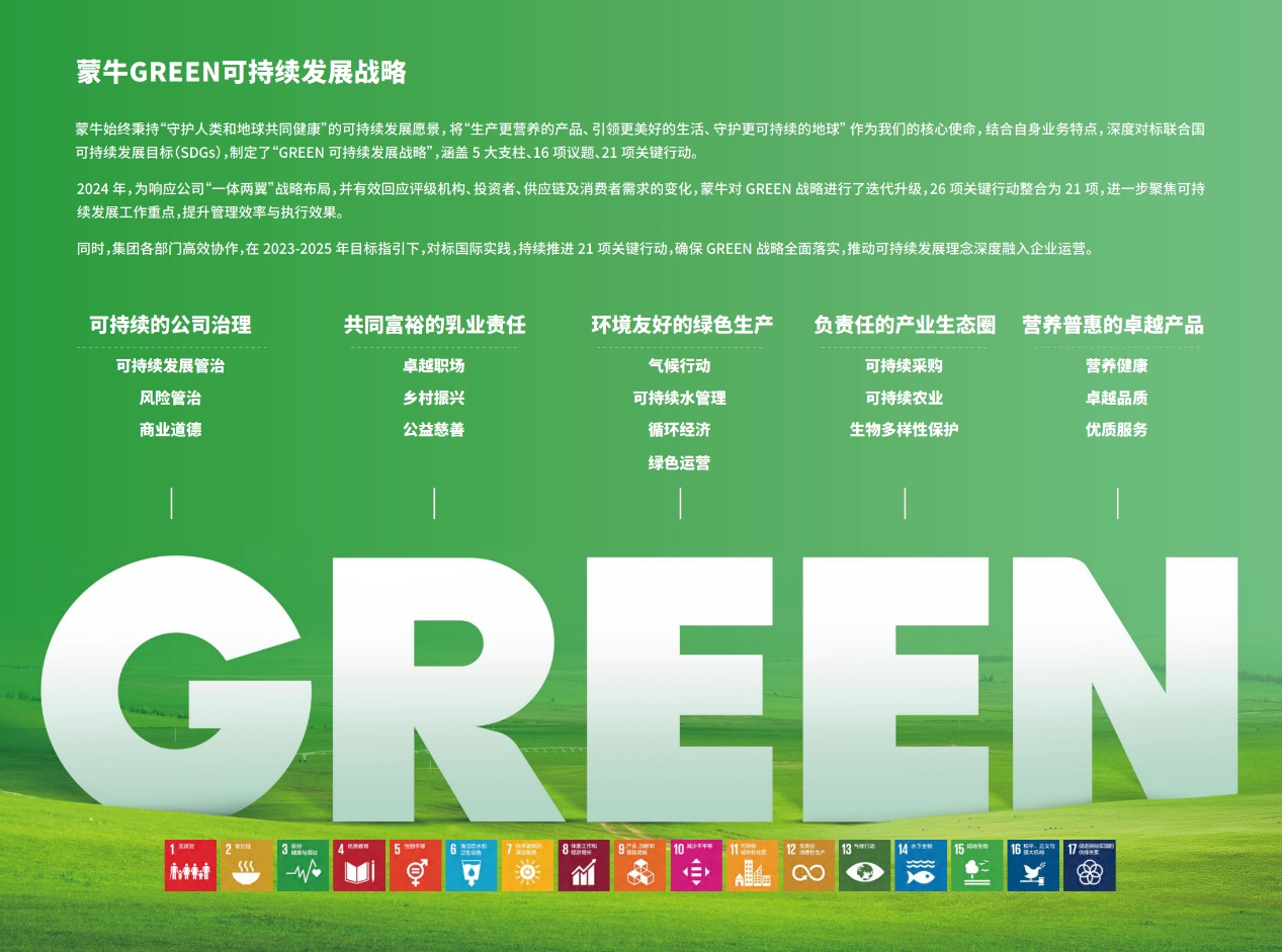 蒙牛以“GREEN战略”为指引,将可持续发展理念融入治理架构与价值链发展过程中,实现环境、社会与经济效益的平衡发展。