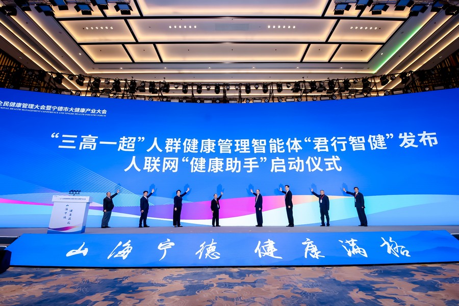 图为三高一超人群健康管理智能体“君行智健”发布与人联网“健康助手”启动仪式。