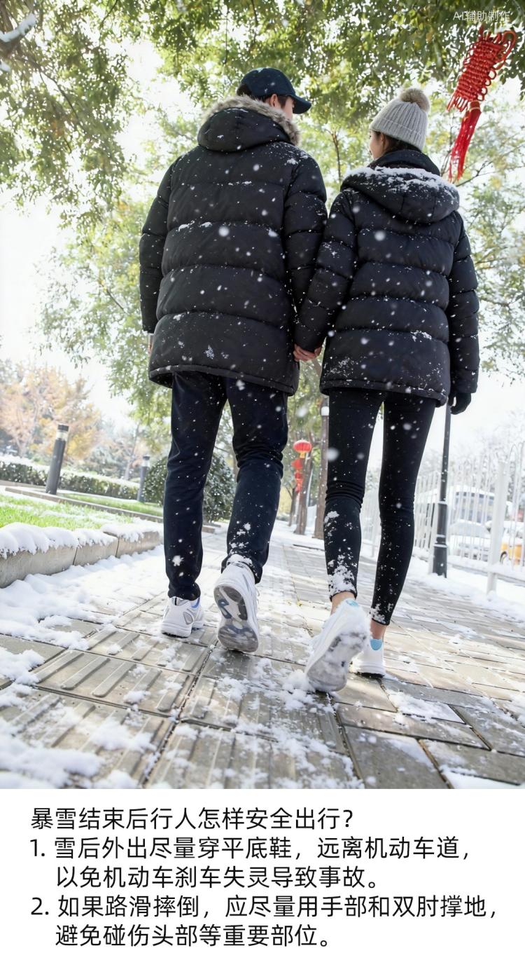 1. 雪后外出尽量穿平底鞋,远离机动车道,以免机动车刹车失灵导致事故。