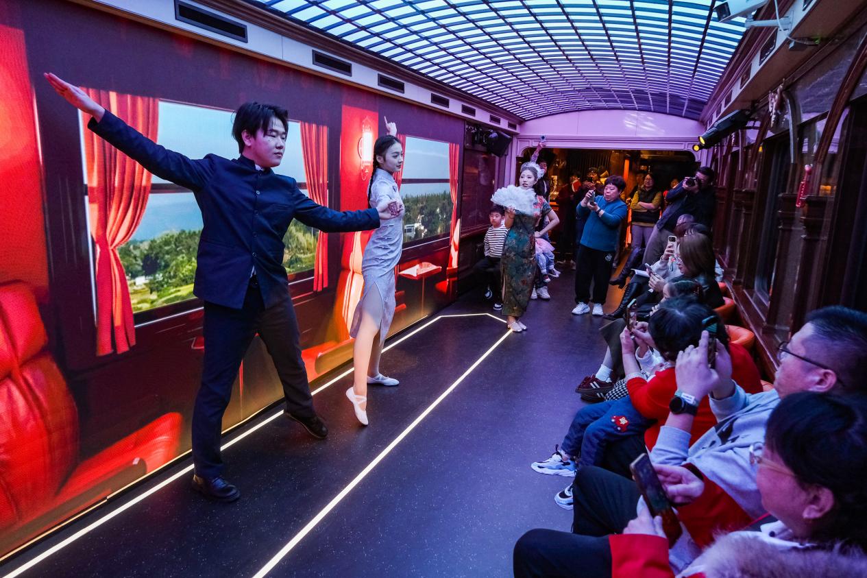 六节特色主题车厢兼具观赏性和舒适性,一节VIP专属车厢突出私享化定制体验,三节互动体验车厢(6910号)通过演艺互动、文化展示与非遗体验,成为全列车的文化“活力引擎”。整列列车实现“可观、可听、可品、可玩”的复合消费场景,让旅程本身成为目的地。