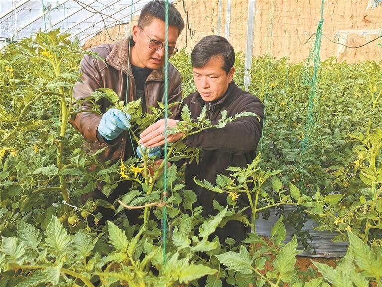 二〇二五年十二月二十三日,豆灰村驻村第一书记韩涛(右)和技术员在为西红柿打杈。通讯员 葛畅摄