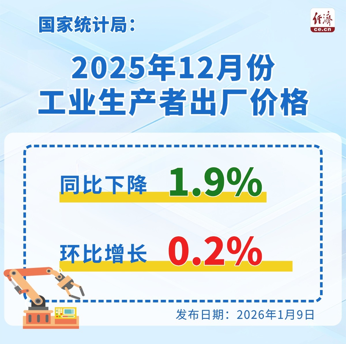 中国经济网北京1月9日讯(记者 刘芃)国家统计局今日发布数据显示,2025年12月份,全国工业生产者出厂价格同比下降1.9%,降幅比上月收窄0.3个百分点;环比上涨0.2%,涨幅比上月扩大0.1个百分点。工业生产者购进价格同比下降2.1%,降幅比上月收窄0.4个百分点;环比上涨0.4%,涨幅比上月扩大0.3个百分点。