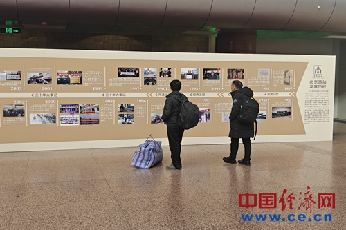 乘客在“北京西站发展历程”展板前驻足观看。中国经济网记者佟明彪/摄