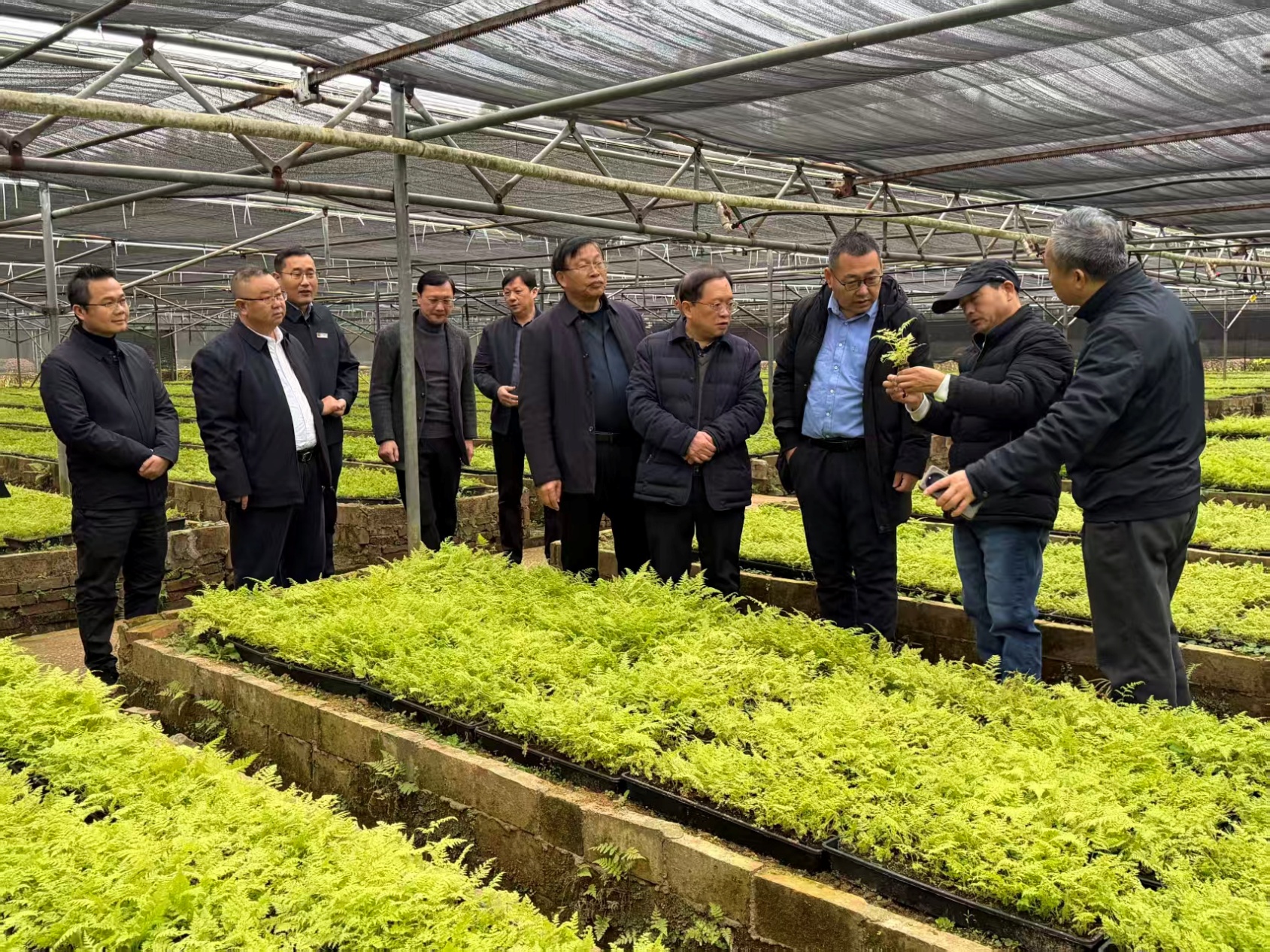 图为陈幸良(右二)在广西融水观察林下作物金毛狗脊育苗情况。(受访者供图)