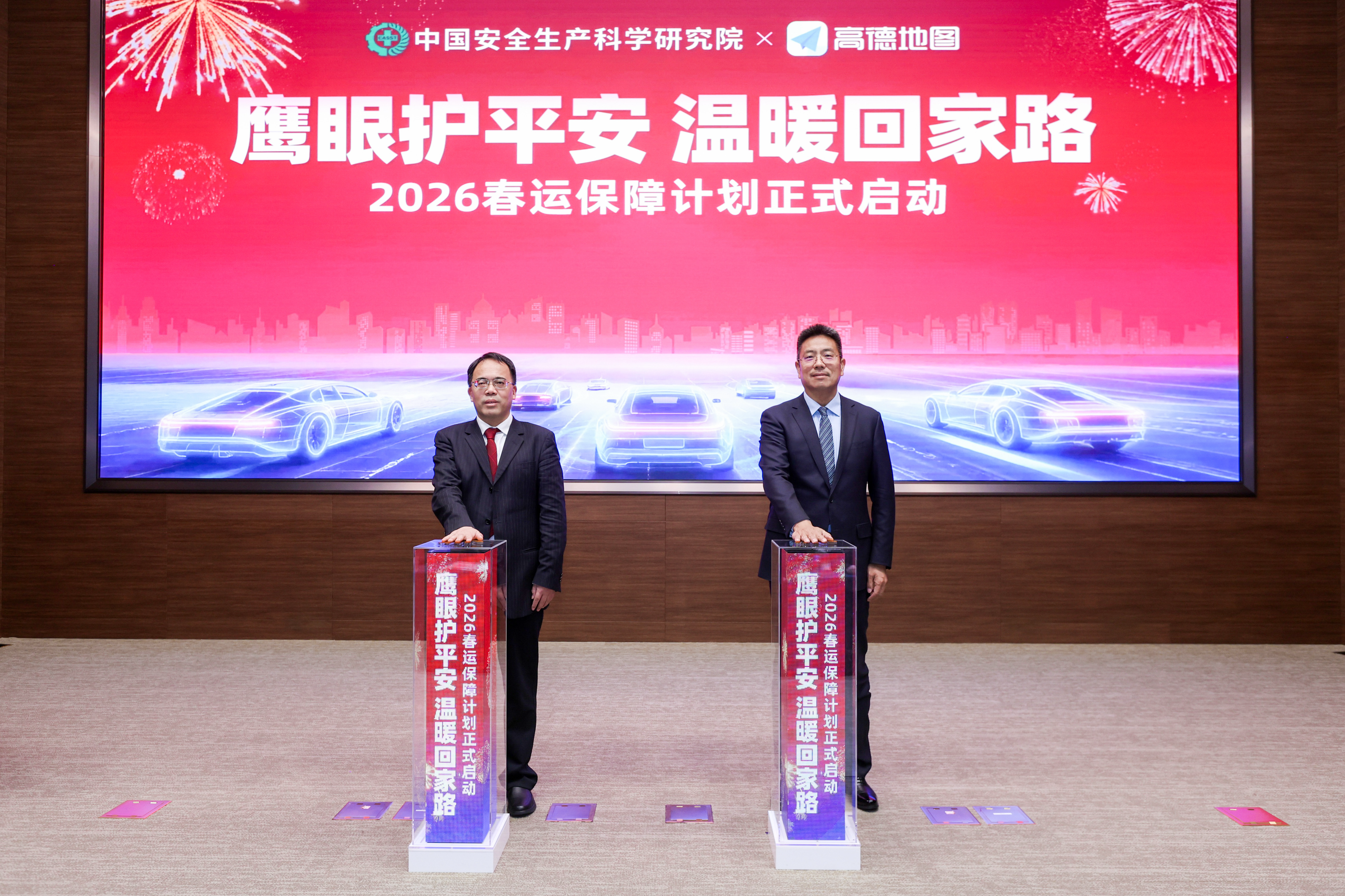 中国安科院院长周福宝(左)与高德董事长刘振飞(右)共同启动2026春运保障计划