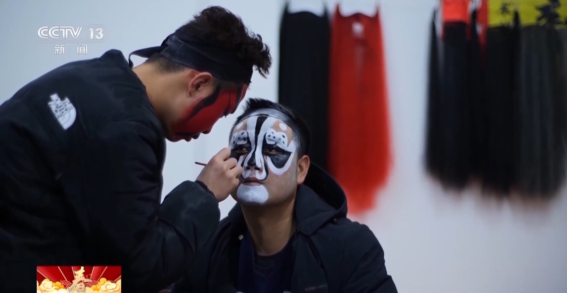 总台央视记者 何莉:这个角色就是社火当中的黑虎赵公明,人们认为他可以除瘟消灾、带来财运。他脸上凸起,看起来非常立体,而这些凸起就是用普通的鸡蛋壳制作而成。