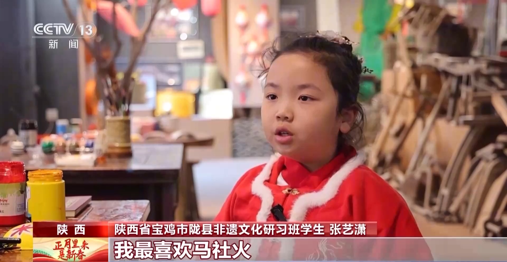 陕西省宝鸡市陇县非遗文化研习班学生 张艺潇:我最喜欢马社火,因为非常威武,我今天还画了社火脸谱。