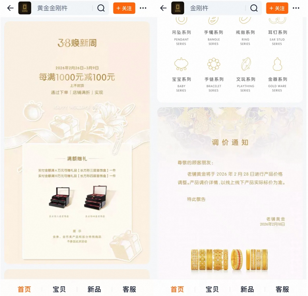 (图说:老铺黄金天猫3·8焕新周活动信息及提价通知)