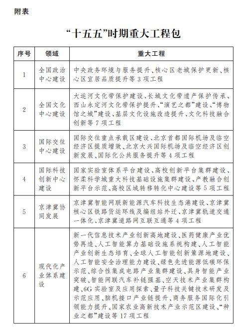 《北京市国民经济和社会发展第十五个五年规划纲要》今天全文公开。记者从北京市发改委获悉,规划纲要坚持战略目标与落地实施有机衔接,对任务部署细化、具体化、项目化,谋划了12个领域100项重大工程,总投资超4万亿元,确保规划纲要目标任务落到实处。