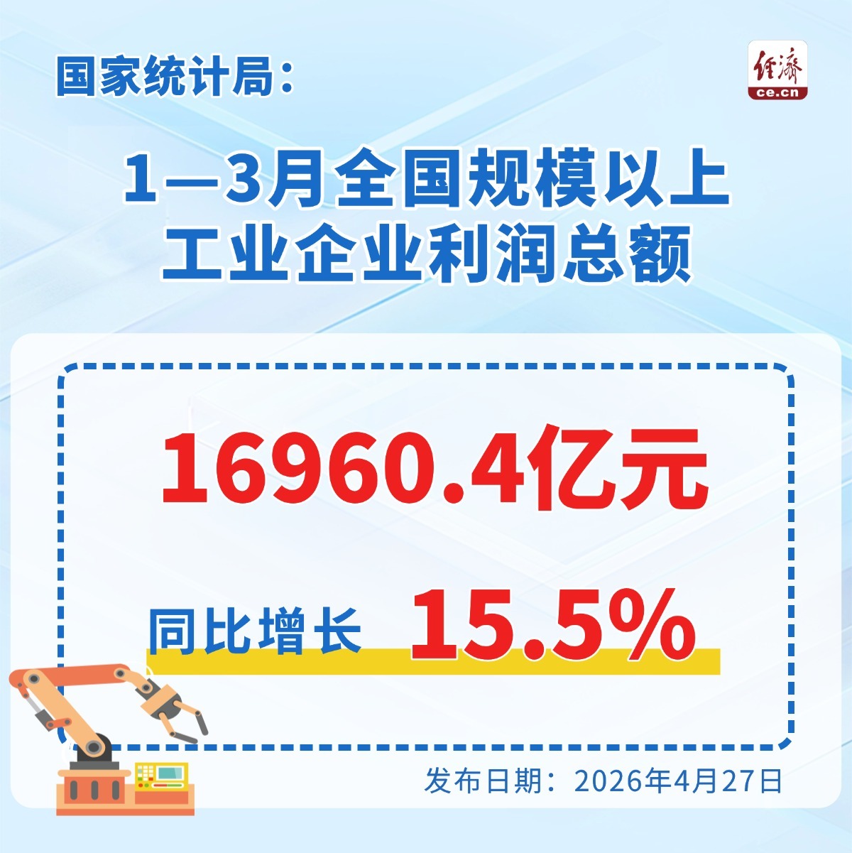 中国经济网北京4月27日讯(记者 刘芃)国家统计局今日发布数据显示,一季度,全国规模以上工业企业实现利润总额16960.4亿元,同比增长15.5%。对此,国家统计局工业司首席统计师于卫宁分析称,一季度,工业经济稳步回升,规模以上工业企业利润增长加快,装备制造业和高技术制造业利润快速增长,原材料制造业利润两位数增长,工业企业效益状况呈现持续改善态势。