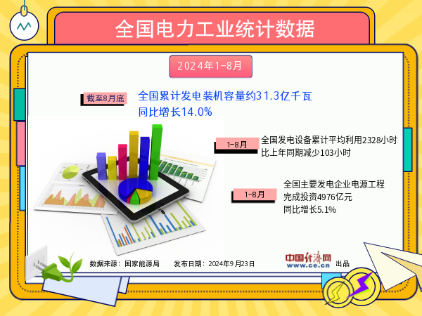 1-8月份,全国发电设备累计平均利用2328小时,比上年同期减少103小时。1-8月份,全国主要发电企业电源工程完成投资4976亿元,同比增长5.1%。电网工程完成投资3330亿元,同比增长23.1%。
