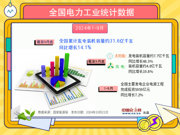 中国经济网北京10月22日讯(记者王婉莹)国家能源局21日发布1-9月份全国电力工业统计数据。截至9月底,全国累计发电装机容量约31.6亿千瓦,同比增长14.1%。