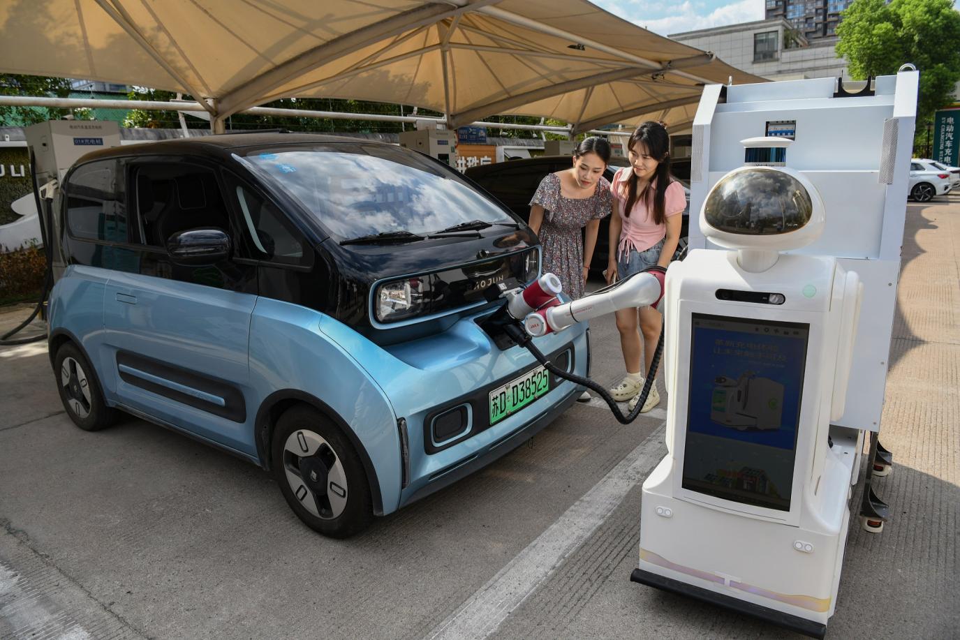 新能源车主在金华市金东区光南充电站体验储能式可移动智能机器人自助充电服务。(周宁/摄)