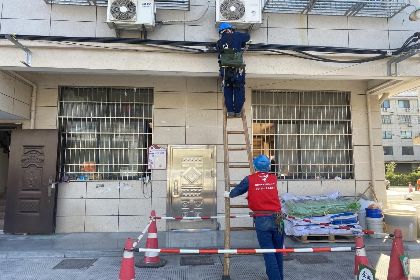 在义乌城西街道流大塘二区,电力作业人员正在绑扎集束电缆。(陈紫涵/摄)