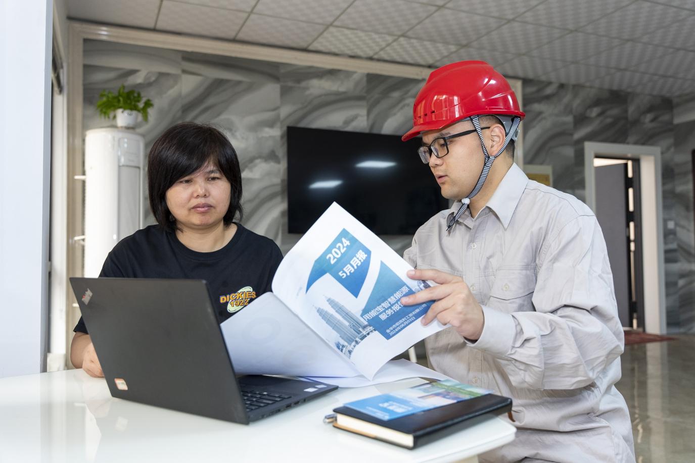 工作人员在金华市伯克利工贸有限公司为企业相关负责人分析5月份用能情况。(梅建微/摄)