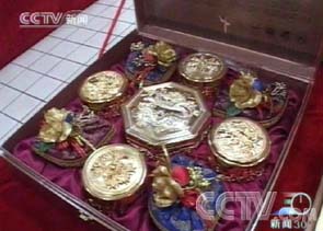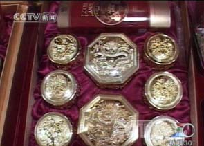 这盒月饼标价1040元,礼盒内装有一瓶“人头马”和镀金刀叉,每块月饼都用镀金模具来装。