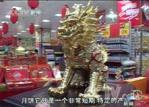 不过,还有更贵的。在广西一家超市的食品部,记者见到了这盒标价为2988元的月饼礼盒,盒子里虽然只装了一块重400克的普通月饼,但在它的上方,却放置了一只镶满人造钻石的金麒麟,超市负责人称,金麒麟才是这盒月饼的最大卖点。