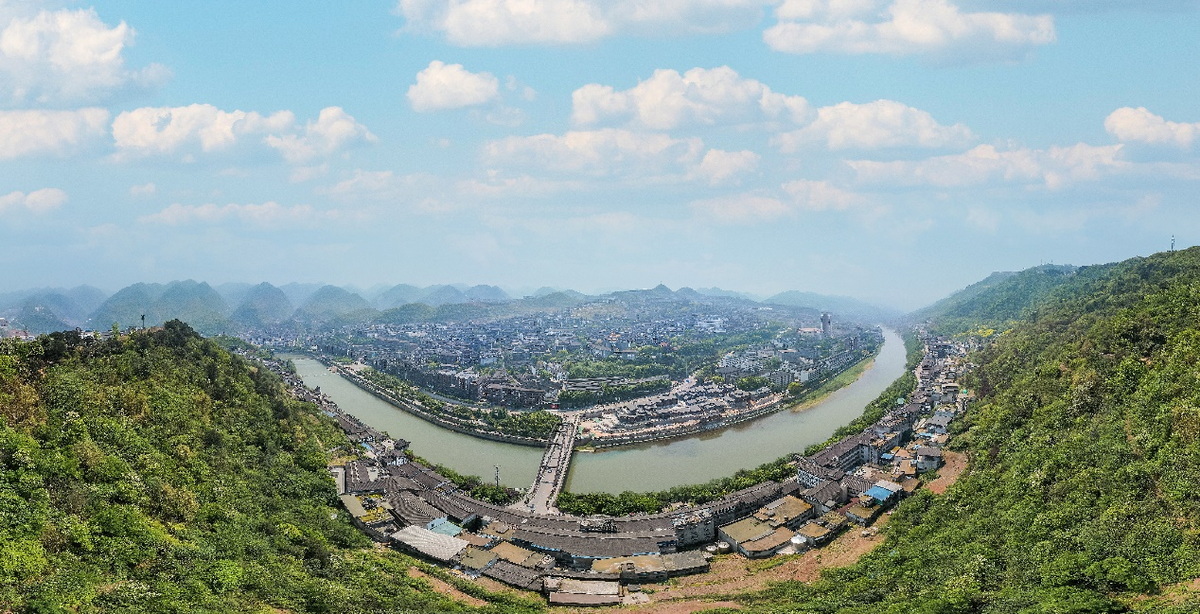 赤水河环抱的茅台镇风光。