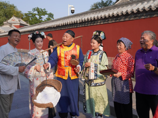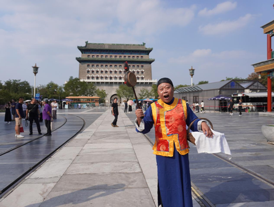 观光巴士一路向前,到达北京中轴线北端钟鼓楼。在钟鼓楼广场上,臧泉江宏亮悠扬的叫卖声再次响起,经典的“臭豆腐,酱豆腐”吆喝声,让在场的市民和游客惊喜不已,还有不少游客跟着臧泉江学习了各种吆喝,并现场“一试身手”。曾经耳熟能详的叫卖声早已不是单纯的喊话,现如今已成为有节奏和曲调的声乐艺术。这一声声的叫卖声,是北京胡同里一道充满烟火气的独特风景,更是北京胡同里的一张京味文化名片。(许子杰)