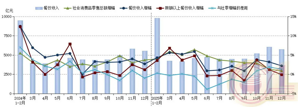国家统计局1月19日发布数据显示,初步核算,2025年全年国内生产总值首次突破140万亿元,比上年增长5.0%;社会消费品零售总额规模超过50万亿元,同比增长3.7%。其中,全国餐饮收入达57982亿元,同比增长3.2%,占社会消费品零售总额的11.6%,较上年提升0.2个百分点,表明餐饮业在推动消费复苏、促进内需增长中发挥着日益重要的作用。限额以上单位餐饮收入16337亿元,同比增长2.0%。2025年12月,全国餐饮收入5738亿元,同比增长2.2%;限额以上单位餐饮收入1463亿元,同比下降1.1%。